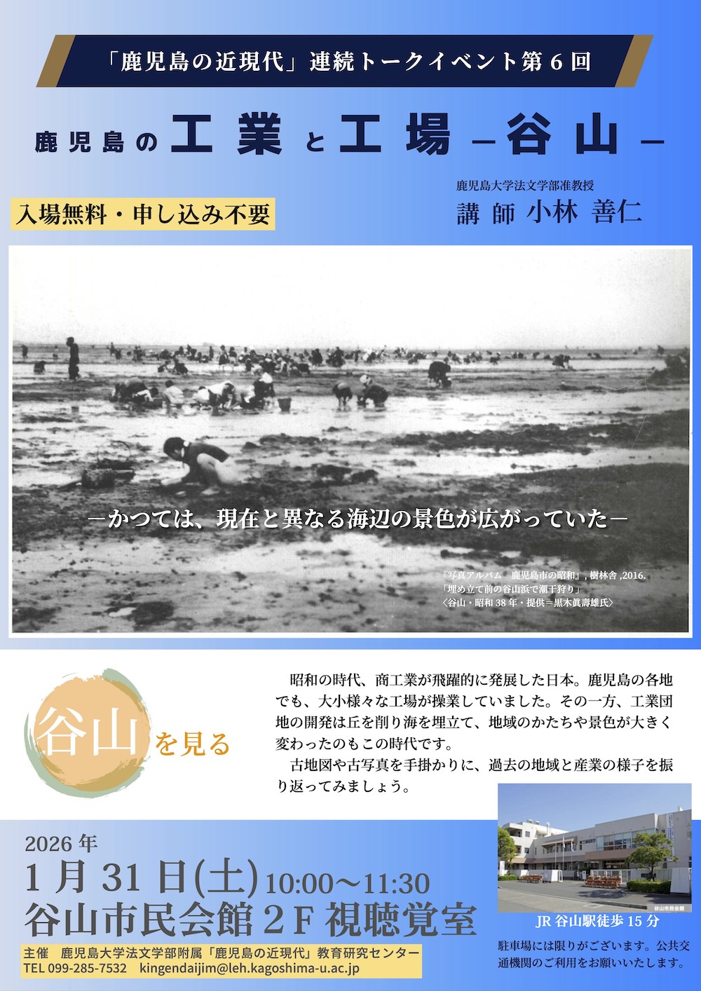 「鹿児島の近現代」教育研究センターでは、令和8年1月31日(土)谷山市民会館にて、「鹿児島の近現代」連続トークイベント「#昭和100」第6回「鹿児島の工業と工場 —谷山—」を開催します。