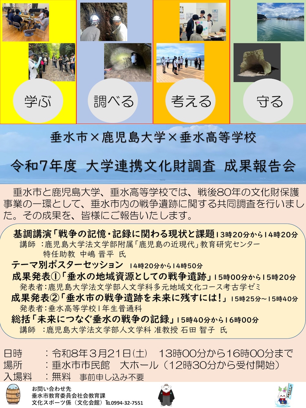 2026年3月21日(土)に、垂水市市民館において、令和7年度大学連携文化財調査成果報告会を開催します。基調講演、高大生による成果発表、ポスターセッションを行います。会場では、成果報告パンフレットも配布します。